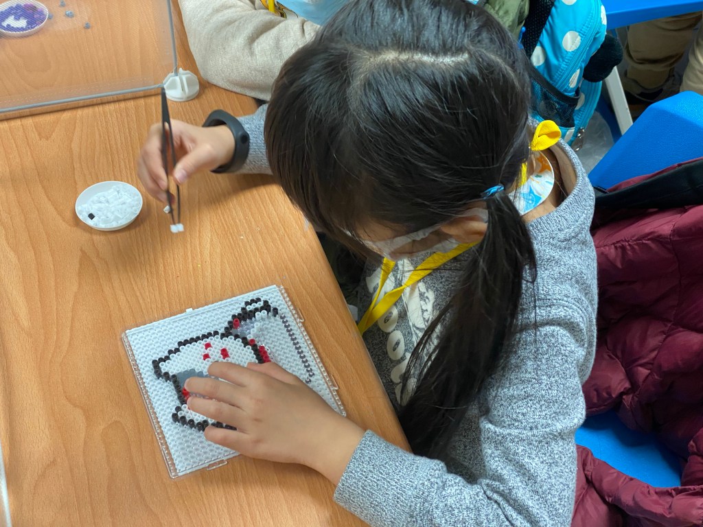 最後這個孩子在一邊討價還價的過程完成了15*15的拼豆作品