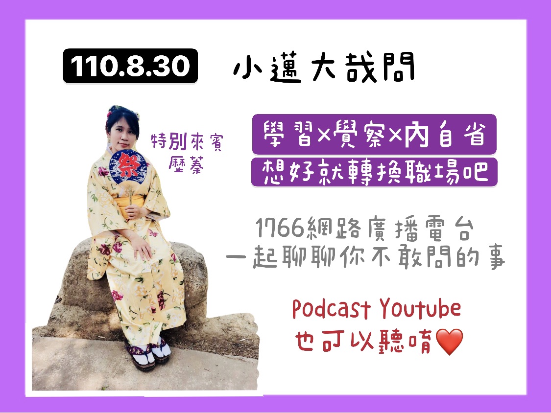 學習x覺察x內自省x想好就轉換職場吧:今天邀請為自己人生力爭上游的歷蓁來討論轉換職場會考量的因素有什麼呢 首播繼續閱讀 “小邁大哉問-27″